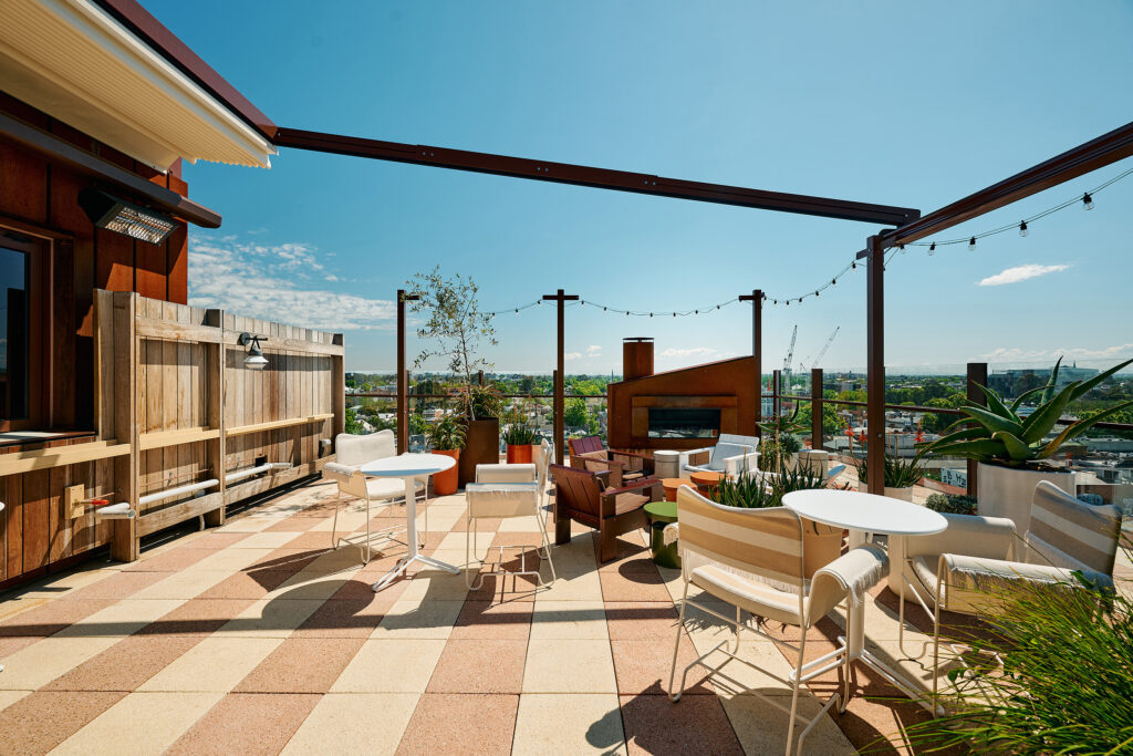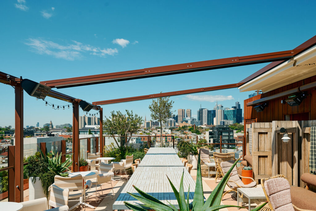 The bar accommodates up to 60 patrons, the interior is inviting and laid-back, with a warm colour palette, arid plantings, and a design that feels like it could only belong to Fitzroy. The architecture, designed by Woods Bagot and Hecker Guthrie, balances old and new. Bar ledges and stools hug the edges of the space, offering sweeping views across Fitzroy and the city skyline. Despite Melbourne’s unpredictable weather, the rooftop is fully weatherproof with a retractable roof and a heating system, making sure guests can enjoy it all year round.