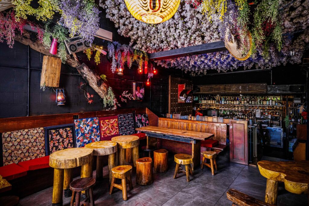 The venue leans into contrast from the start. Upstairs, it’s soft and open – a Sakura-style ceiling washes the room in pink, with seating spread across tables and booths that push guests to settle in rather than hover. Downstairs, it flips completely. A hidden basement “whisky dungeon,” built from an old boat and tucked behind a discreet entry, trades light for mood – tighter, darker, and designed for longer conversations over serious pours.